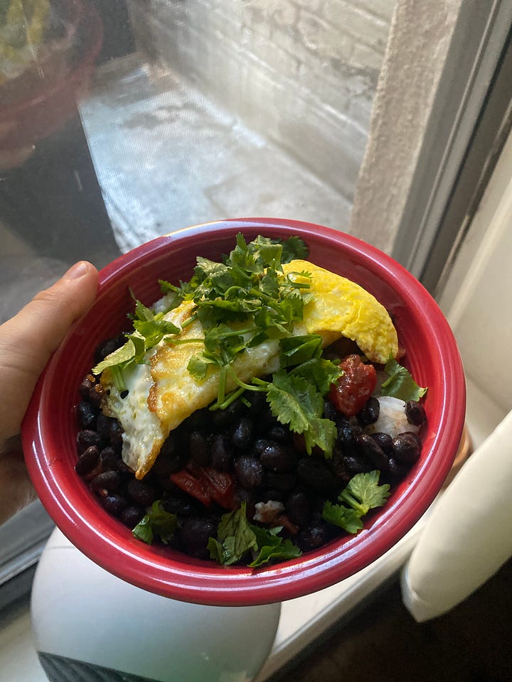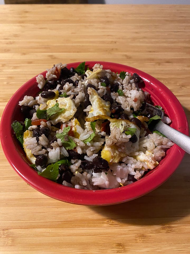 My intention with this meal was to throw together a quick, easy dinner. I put a pot of rice on to simmer. I sautéed beans and tomatoes and spices together. I fried an egg to put on top.
