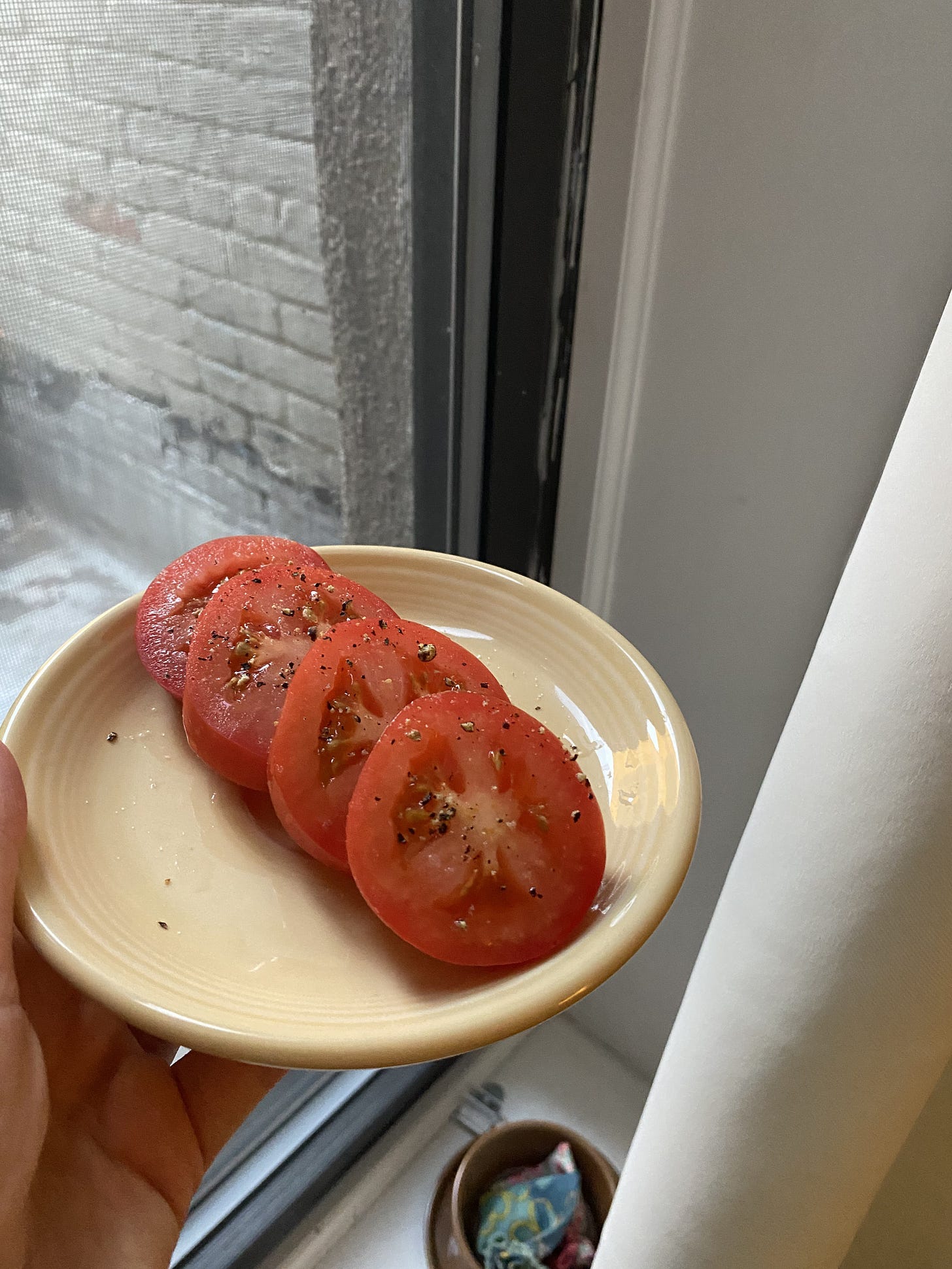 Last summer, I was staying with my boyfriend and his parents during tomato season. They have a beautiful garden, and we ate the most delicious home-grown tomatoes I have ever known. I’m kicking myself that I didn’t take a picture, but they were enormous and unbelievably flavorful. I ate so many slices of tomato with salt and pepper while I was there, and it is genuinely one of my fondest culinary memories. I tried to replicate the experience this week, and although my store-bought Roma tomatoes can’t hold a candle to the real deal, a tomato with salt and pepper is always going to be pretty compelling.