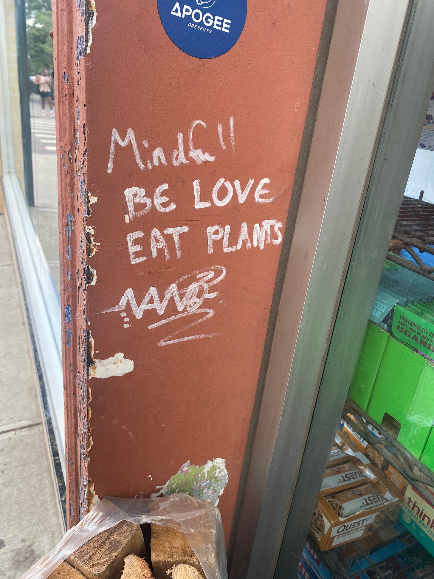 I really liked this piece of graffiti I saw the other day. Be love. Eat plants.